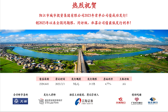 2024年1月19日,市城投集團在深圳證券交易所成功發(fā)行“陽江市城市投資集團有限公司2024年面向?qū)I(yè)投資者非公開發(fā)行公司債券”。本期債券發(fā)行規(guī)模為5.5億元,期限為5(3+2)年,票面利率3.10%,全場認購倍數(shù)超過4.8倍,是...